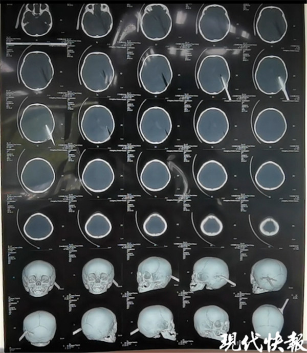 只見急救室的病床上,幼兒的頭發(fā)已經被剃光,一把修腳刀赫然插入頭部左后側,裸露在外的部分大約有十來公分長。而從CT影像圖來看,插入頭部的部分也有三四公分長。醫(yī)務人員希望救援人員將裸露在頭部外的修腳刀切斷,但由于位置的特殊性,不能采用電動切割裝置,只能用大力鉗小心翼翼地進行剪切。