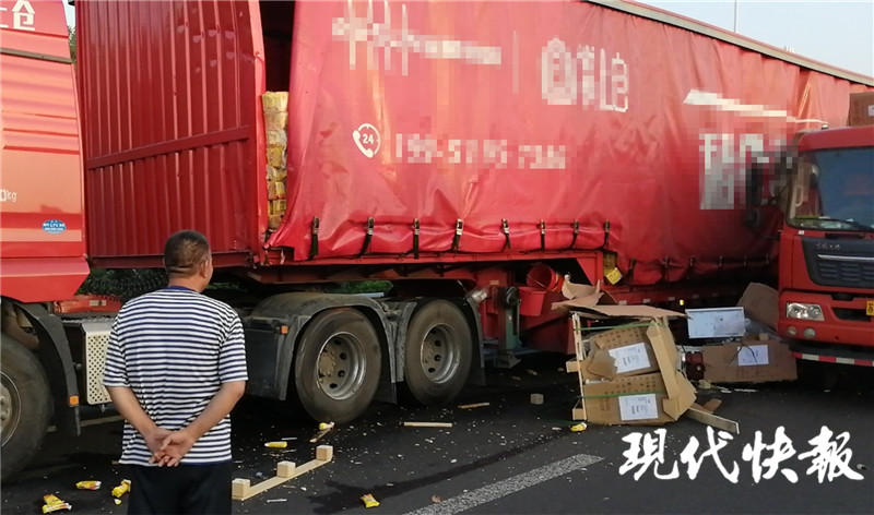 民警行駛至事故現(xiàn)場后,迅速設好警示標志,只見行車道上停著兩輛貨車,一輛蘇A牌照黃牌貨車,車上的貨物跌落一地,車子的尾部有被撞擊的痕跡。另一輛廂式黃牌物流車駕駛員告訴民警,事發(fā)時對方車子停在路中,而且占了兩股行車道,自己避讓不及才撞了上去。在確認沒有人員受傷后,民警快速處置,恢復交通。
