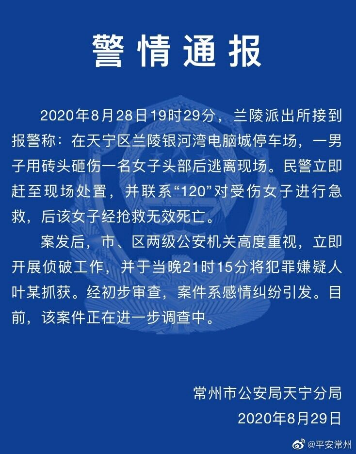 通報(bào)稱:8月28日19時(shí)29分,蘭陵派出所接到報(bào)警稱:在天寧區(qū)蘭陵銀河灣電腦城停車場(chǎng),一男子用磚頭砸傷一名女子頭部后逃離現(xiàn)場(chǎng)。民警立即趕至現(xiàn)場(chǎng)處置,并聯(lián)系“120”對(duì)受傷女子進(jìn)行急救,后該女子經(jīng)搶救無(wú)效死亡。案發(fā)后,常州市、區(qū)兩級(jí)公安機(jī)關(guān)高度重視,立即開(kāi)展偵破工作,并于當(dāng)晚21時(shí)15分將犯罪嫌疑人葉某抓獲。