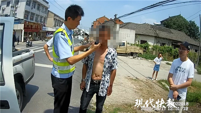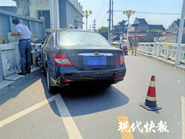 接警后,值班民警朱泉帶輔警迅速趕到現(xiàn)場,發(fā)現(xiàn)一輛蘇MUK1XX的轎車撞撞擊護欄后氣囊被彈出,車輛損失較大,駕駛員受了輕傷,從駕駛室爬出,癱坐在橋邊。