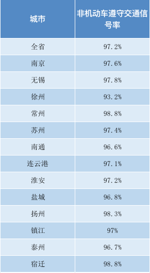 全省各地非機(jī)動(dòng)車(chē)遵守交通信號(hào)燈率平均值為97.2%,常州、揚(yáng)州、宿遷等地非機(jī)動(dòng)車(chē)遵守交通信號(hào)率均超過(guò)98%。