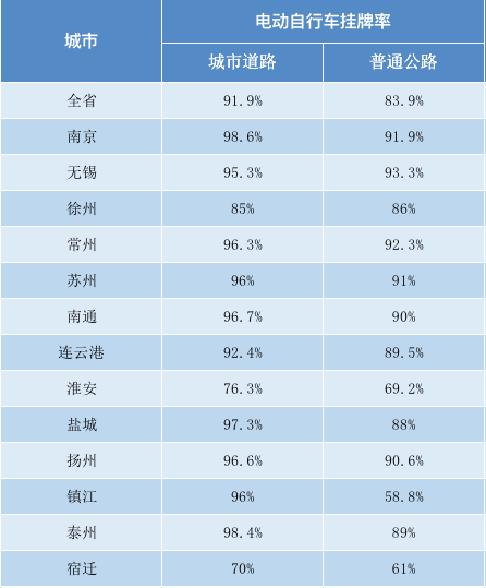 全省城市路口電動(dòng)自行車(chē)掛牌率平均值為91.9%,其中南京最高為98.6%;全省國(guó)省道普通公路電動(dòng)自行車(chē)掛牌率平均值為83.9%,其中無(wú)錫最高為93.3%。