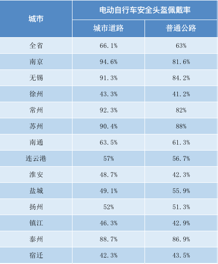 全省城市路口電動(dòng)自行車(chē)駕乘人員頭盔佩戴率平均值為66.1%,其中南京最高為94.6%;全省國(guó)省道普通公路電動(dòng)自行車(chē)駕乘人員頭盔佩戴率平均值為63%,其中蘇州最高為88%。