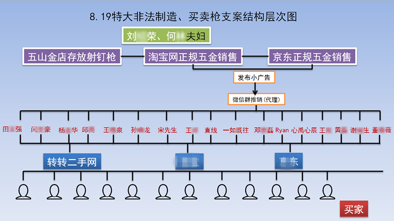 經(jīng)專案組梳理,截至案發(fā),全國已有300余人購買了這款射釘槍。今年2月,專案組又發(fā)現(xiàn)劉某容此前以女兒名義開設(shè)了一家網(wǎng)店,雖已被關(guān)停,但也是劉某容夫婦的一條販槍渠道,經(jīng)民警仔細(xì)研判、抽絲剝繭,又從中獲得近千條網(wǎng)絡(luò)販槍線索,買家遍布全國32個省市。