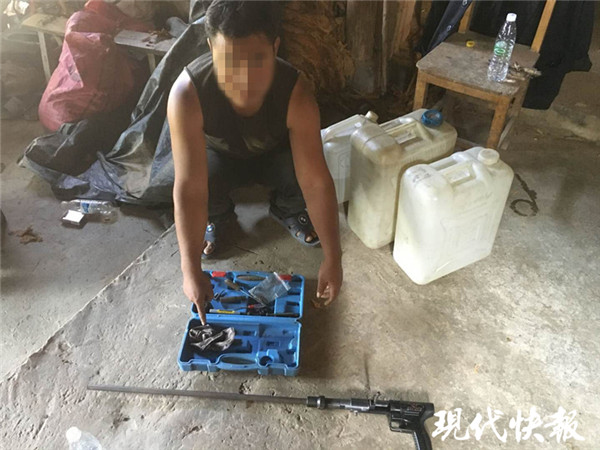 “名為射釘器,其實(shí)就是一支改造的火藥槍。”南通市公安局刑警支隊四大隊副大隊長戴建峰說,該款射釘槍以用于生產(chǎn)工具的射釘器為主體,通過購買相關(guān)配件進(jìn)行改裝,形成以火藥為動力的火藥槍,發(fā)射的彈丸速率最高達(dá)到510m/s,遠(yuǎn)遠(yuǎn)大于64式手槍彈320m/s的槍口速度,殺傷力強(qiáng)大。