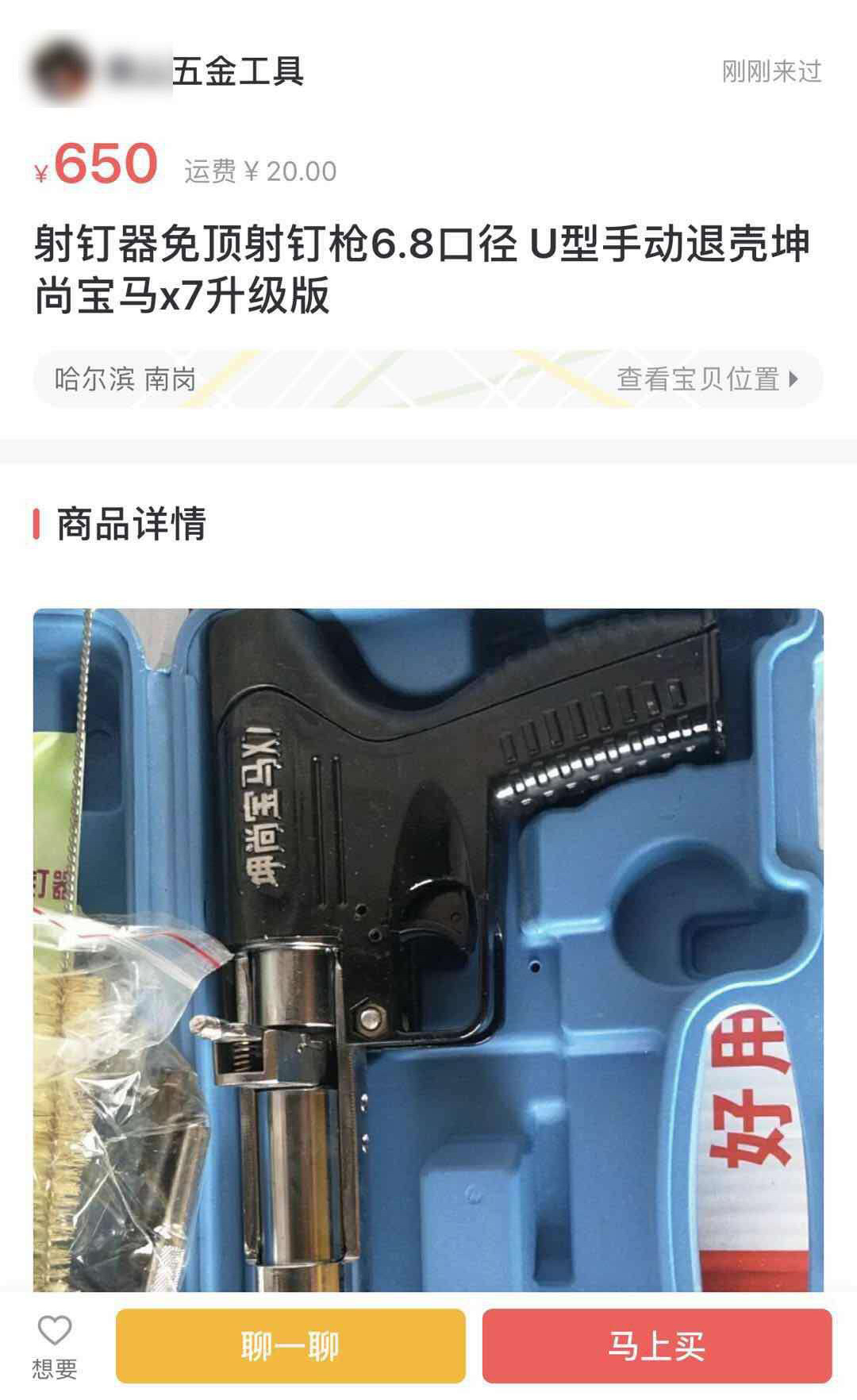 2019年4月,南通市公安局刑警支隊打擊網(wǎng)絡(luò)販槍工作專班通過網(wǎng)上巡查發(fā)現(xiàn),有人通過網(wǎng)絡(luò)非法渠道,購買一款名為“坤尚寶馬x7免頂射釘器”的射釘槍,并進(jìn)行改裝、制造火藥槍。