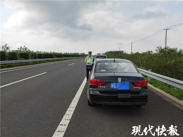 9月11日上午10點左右,鹽城高速五大隊民警正在G1516鹽洛高速巡邏時,在99公里處發(fā)現(xiàn)一輛黑色轎車停在應急車道。“沒開啟危險報警閃光燈,無任何安全防護措施,當時正值車流高峰期,非常危險。”民警立即停車,并上前查看情況。