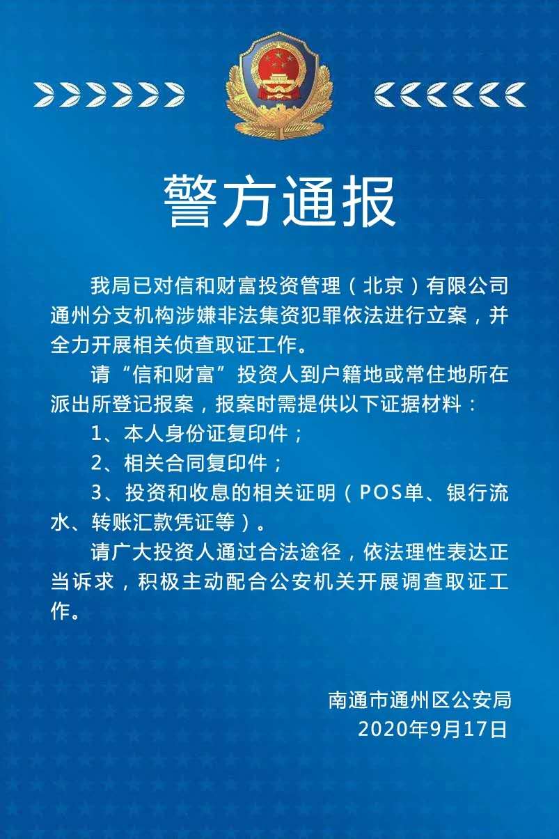 (記者 嚴君臣)9月17日,南通市通州區(qū)公安局發(fā)布一則通報。內(nèi)容顯示,該局已對信和財富投資管理(北京)有限公司通州分支機構(gòu)涉嫌非法集資犯罪依法進行立案,并全力開展偵查取證工作。