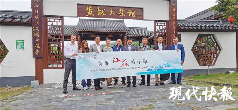 △外媒記者在黃龍大茶館外合影留戀,他們在這里體驗了采茶