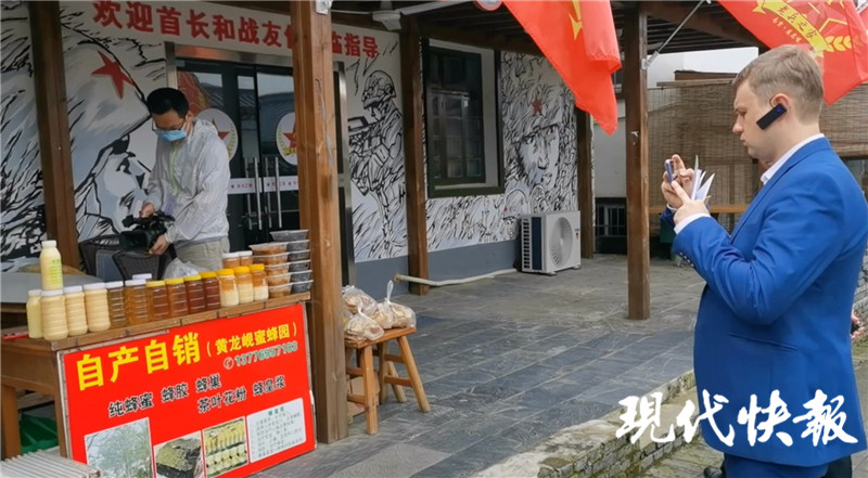 △在南京黃龍峴,外媒記者駐足拍攝當(dāng)?shù)卮迕褡援a(chǎn)自銷的特產(chǎn)