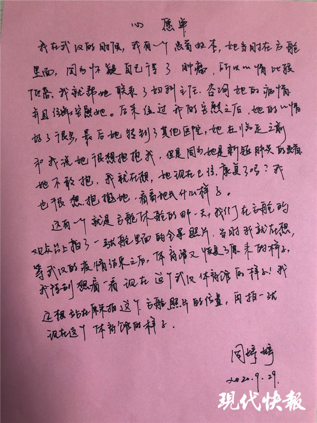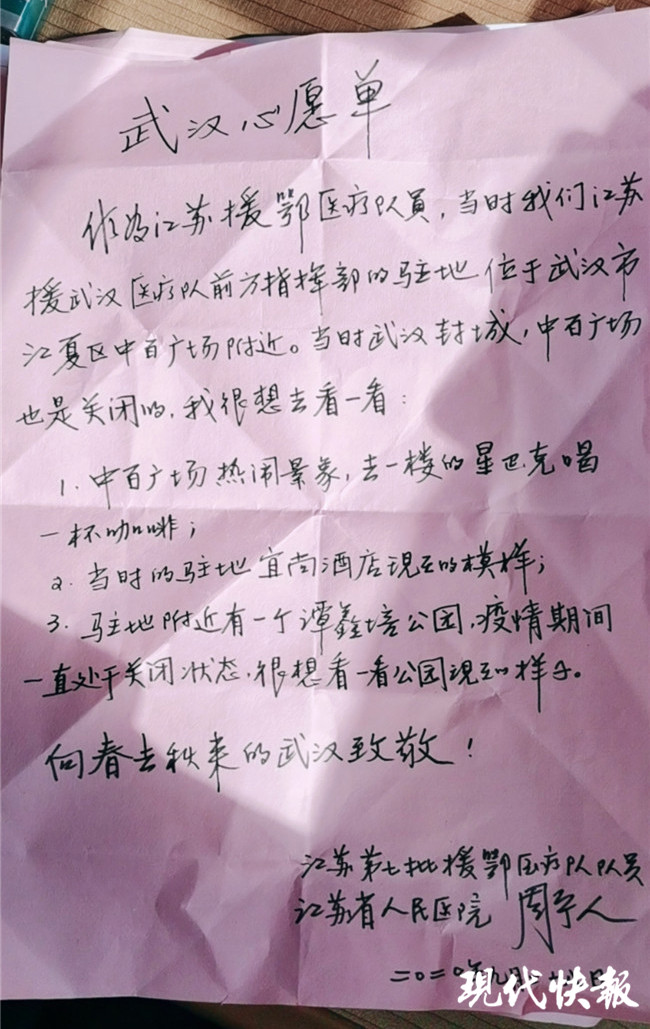 這一份份援鄂英雄們的“心愿單”都被妥善保存,在10月1日早上,隨著現(xiàn)代快報(bào)“坐著高鐵看中國(guó)——同心戰(zhàn)疫家國(guó)安”直播間一同回到英雄城市武漢。國(guó)家(江蘇)緊急醫(yī)學(xué)救援隊(duì)領(lǐng)隊(duì)、江蘇省人民醫(yī)院急診科副主任、主任醫(yī)師陳旭鋒,通過(guò)鏡頭和網(wǎng)友們進(jìn)行了分享。