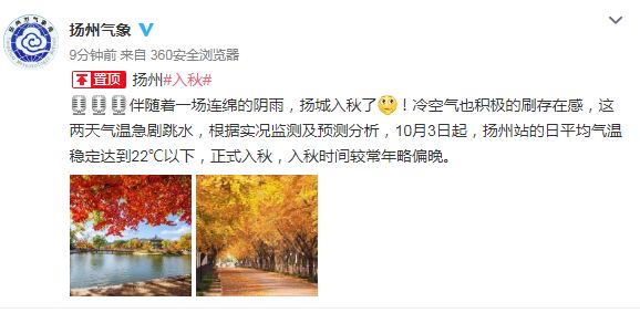 (記者 顧瀟)10月4日,揚州氣象微博發(fā)布稱,10月3日揚州正式入秋,入秋時間比往年稍晚。