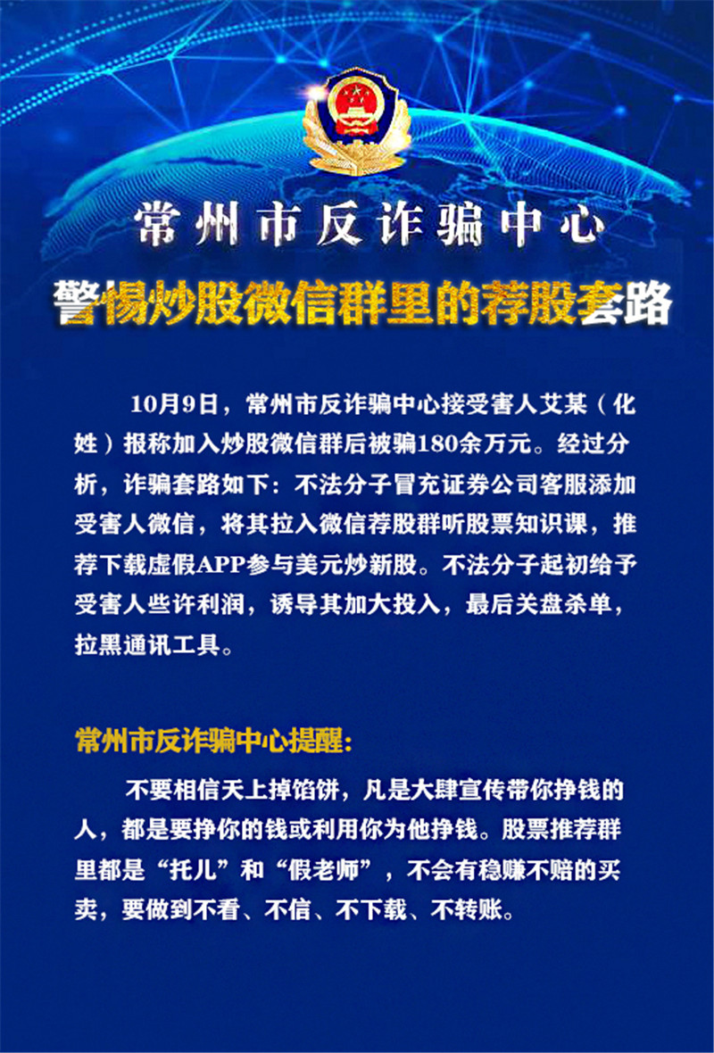 常州市反詐騙中心提醒市民,沒有人能保證穩(wěn)賺不賠,凡是大肆宣傳帶你掙錢的人,其實都是想要掙你的錢,群里的那些炒股群友們一般也都是“托兒”,因此遇到類似情況,要做到“不看、不信、不下載、不轉(zhuǎn)賬”,畢竟天上不會掉餡餅。