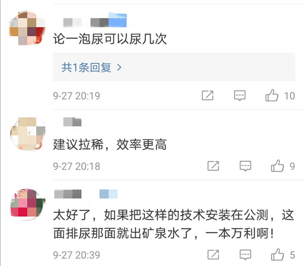 該馬桶吸引了許多人的眼球,網(wǎng)友們的評(píng)論也是腦洞大開:“祝宇航員們?nèi)鐜淇?”“我們不生產(chǎn)水,我們是尿液的搬運(yùn)工。”“昨天的咖啡變成了明天的咖啡。”甚至有網(wǎng)友提議,地球上也盡快用起這款“了不起”的馬桶:“如果把這款馬桶安裝在公廁,這邊排尿,那邊就出礦泉水了,一本萬利啊。”