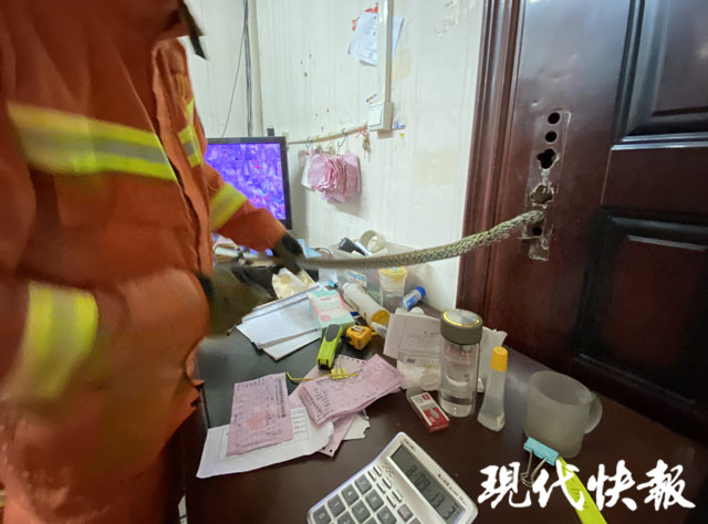 消防員發(fā)現(xiàn),這扇門的另一側(cè)被貨架擋住,指揮員立即指揮將貨架清理到一旁,讓蛇頭露出來。做好防護措施后,消防人員通過刺激蛇頭,讓其退縮回到門的另一側(cè),再把蛇拽出來。