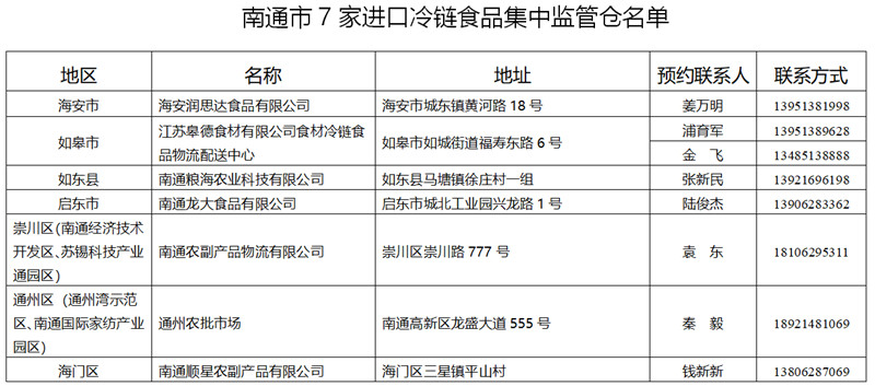 一、從2020年11月23日起,南通海安市、如皋市、如東縣、啟東市、崇川區(qū)、通州區(qū)、海門區(qū)各設(shè)立1個(gè)進(jìn)口冷鏈?zhǔn)称芳斜O(jiān)管倉(以下簡稱“集中監(jiān)管倉”),南通經(jīng)濟(jì)技術(shù)開發(fā)區(qū)、蘇錫通科技產(chǎn)業(yè)園區(qū)與崇川區(qū)共用集中監(jiān)管倉,通州灣示范區(qū)、南通國際家紡產(chǎn)業(yè)園區(qū)與通州區(qū)共用集中監(jiān)管倉。集中監(jiān)管倉設(shè)置和運(yùn)行根據(jù)實(shí)際需要,全市統(tǒng)籌,動態(tài)調(diào)整。