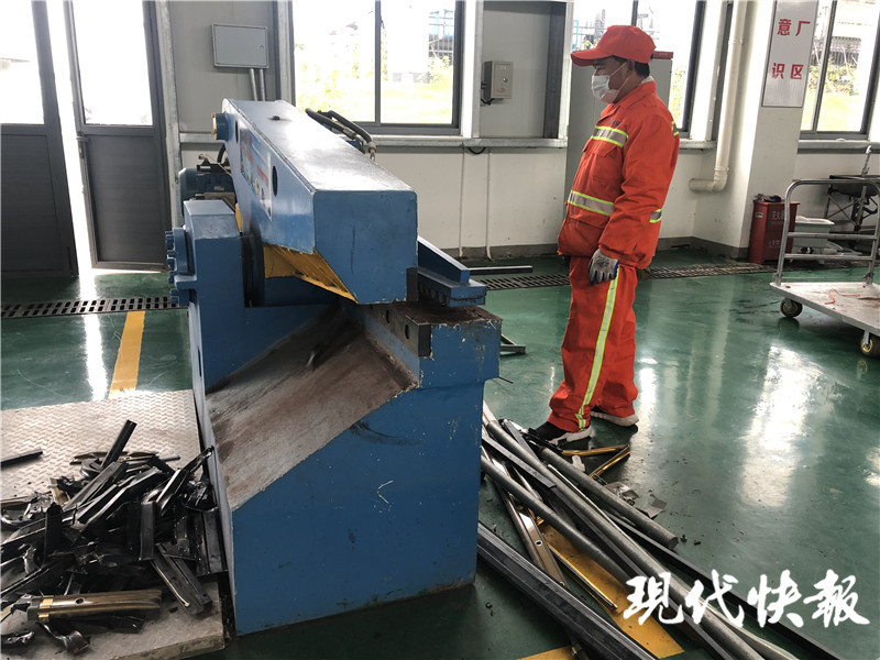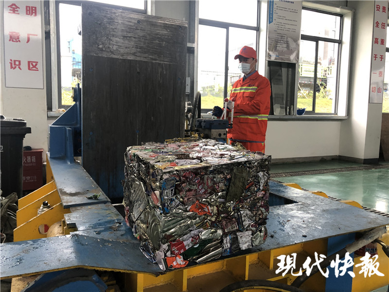 23日,在溧水區(qū)居民生活物品分揀(貯存)中心,工人正在對各類可回收物進(jìn)行分揀處理。只見工人將長條的廢舊鋼管切成小段,并和易拉罐等其他金屬可回收物,放入一旁的壓縮機(jī)中。不到10分鐘,各類金屬都被壓成一塊立方體。而大件垃圾也在此進(jìn)行拆解分揀、分類貯存、分類處置。