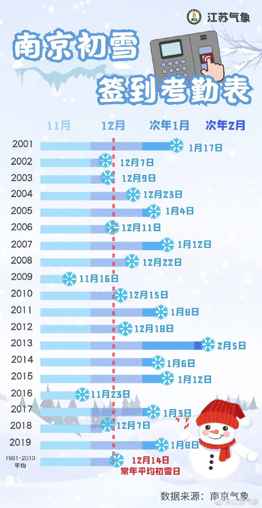 江蘇氣象也統(tǒng)計了1981年到2010年南京初雪時間,常年的初雪時間在12月14日。天氣越來越冷了,猜猜看南京的初雪何時來臨。