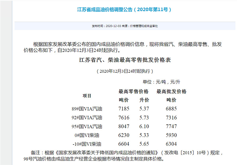 (記者 張瑜)油價(jià)迎來今年第六次上調(diào)!12月3日下午,國家發(fā)改委發(fā)布成品油調(diào)價(jià)通知,自2020年12月3日24時(shí)起,國內(nèi)汽、柴油價(jià)格每噸分別提高250元和240元?,F(xiàn)代快報(bào)記者從江蘇省發(fā)改委獲悉,此次調(diào)價(jià)后,江蘇92號(hào)汽油上漲至5.73元/升,95號(hào)汽油漲至6.10元/升,重回“6元時(shí)代”。按照92號(hào)汽油每升漲0.19元來算,油箱容量50升的車主加滿一箱油,要比調(diào)價(jià)前多花9.5元。