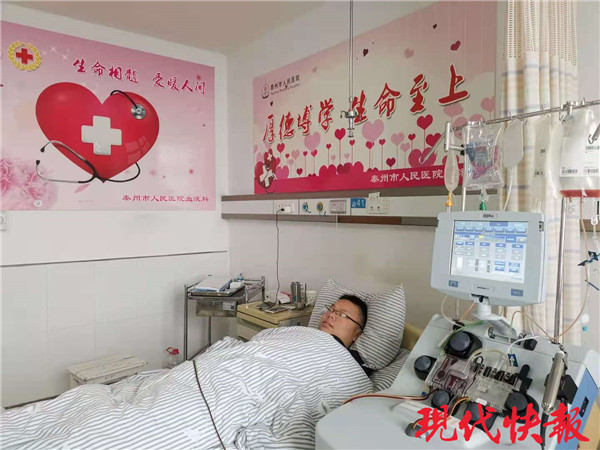 11月24日上午,揚州儀征小伙張晨雨在泰州開始造血干細胞的捐獻。陪伴在身旁的,是他的未婚妻王萌。
