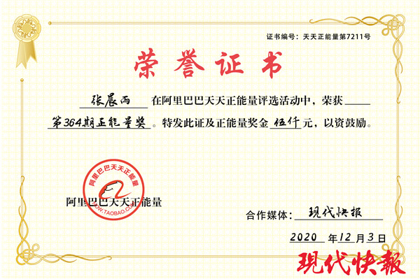 小伙捐獻干細胞推遲婚禮的事跡,經(jīng)現(xiàn)代快報報道后,引起了知名公益平臺阿里巴巴天天正能量的關(guān)注。12月3日,在揭曉的第364期正能量周評選中,經(jīng)媒體評委和正能量合伙人評委投票、網(wǎng)友點贊,張晨雨獲得第364期正能量獎,獎金5000元。
