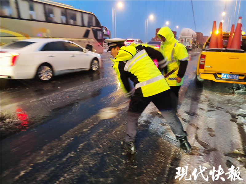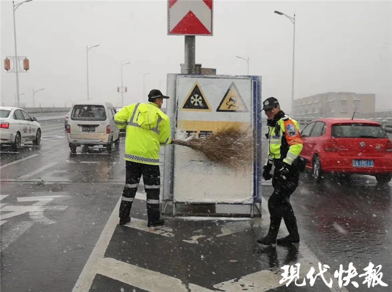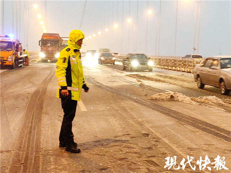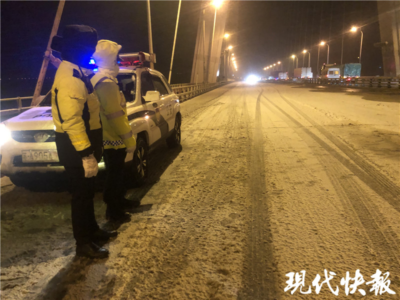(通訊員 寧交軒 記者 王瑞)受寒潮影響,12月29日南京飄起了漫天大雪,部分路段尤其高速上已經(jīng)出現(xiàn)積雪。針對(duì)這一情況,南京交警已經(jīng)有序布撒融雪劑,同時(shí)為防止降溫后路面結(jié)冰,目前高速路段鏟雪車已經(jīng)“上線”。此外,為確保車輛出行安全,像南京棲霞山長江大橋、大勝關(guān)長江大橋等,因橋面積雪較多,交警已經(jīng)站在橋面疏導(dǎo)交通;南京江心洲大橋已開啟爆閃燈提醒過往車輛注意安全。