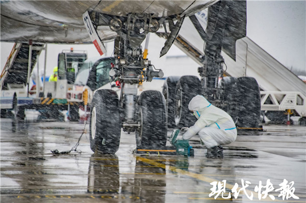 11:00,鵝毛般的大雪籠罩了徐州機場整個機坪。2臺吹雪車同步在跑道上呈人字形推出,發(fā)出振聾發(fā)聵的轟鳴聲,瞬間跑道路面積雪在發(fā)動機尾流的作用下化成了蒸汽。13:37,南京機場機坪上飄起雪花,幾名除冰員站在離地八九米高的除冰車車斗上,緊握近10多公斤的高壓噴槍,在機身、大翼、尾部噴灑除冰液,雙手凍得通紅。