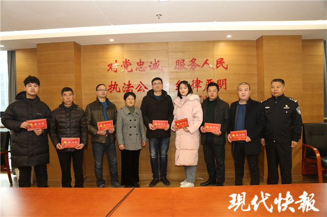 1月6日上午9點(diǎn)半,除了3位熱心人因?yàn)橛惺?,其?人來到經(jīng)開區(qū)橫林交警中隊(duì),經(jīng)開區(qū)見義勇為基金會對他們進(jìn)行了集體表彰和獎勵。