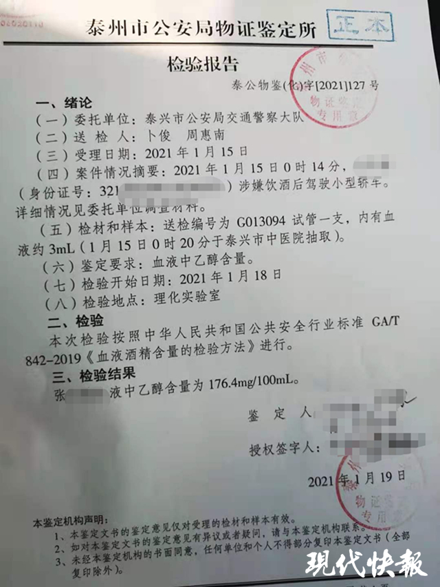 1月19日,醫(yī)院血檢驗(yàn)結(jié)果顯示,張某酒精含量達(dá)到176.4mg/100ml,遠(yuǎn)遠(yuǎn)超過醉駕標(biāo)準(zhǔn)。