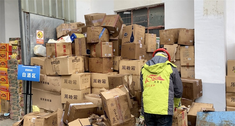 在待銷毀展示區(qū),現(xiàn)代快報(bào)記者看到,成堆的假劣白酒正等待被銷毀,現(xiàn)場(chǎng)工作人員拆開包裝盒,將假酒放在銷毀機(jī)器的傳輸軌道上,隨著機(jī)器的轟鳴聲,短短幾分鐘的時(shí)間,假酒被粉碎,玻璃渣也被傾倒在鐵盒中。