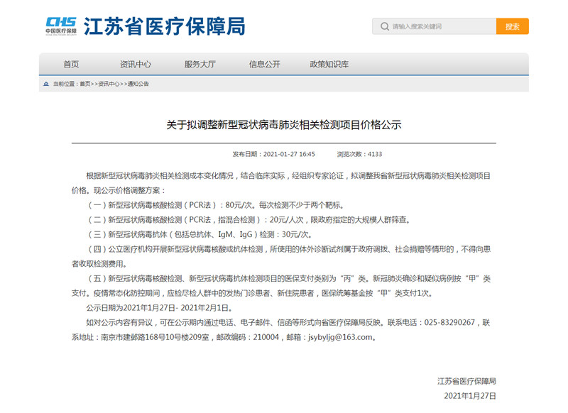 降價(jià)!江蘇擬調(diào)整新型冠狀病毒肺炎相關(guān)檢測項(xiàng)目價(jià)格