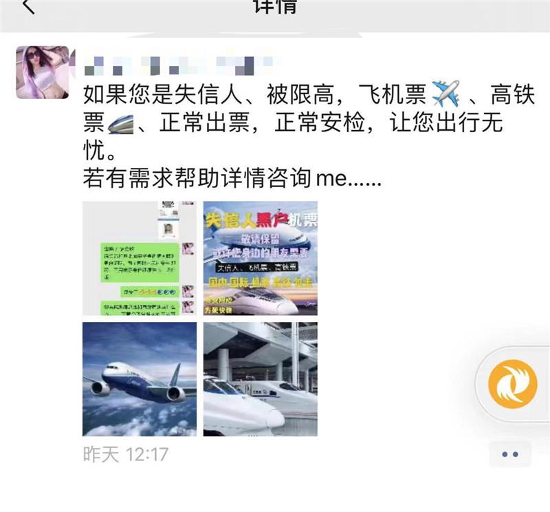 (記者 張瑾 陳子秋/文)“只要給錢(qián),肯定能給你買(mǎi)到,每張加1100元手續(xù)費(fèi)。”近日,被媒體曝光有黃牛從事給失信人買(mǎi)機(jī)票業(yè)務(wù)后,雖然多家聊天平臺(tái)都加強(qiáng)了監(jiān)管,一些個(gè)人及群名帶明顯“老賴代購(gòu)”等標(biāo)識(shí)的賬號(hào)基本都被強(qiáng)制注銷,但現(xiàn)代快報(bào)記者發(fā)現(xiàn)仍有一些黃牛潛伏,只不過(guò)披上了一層“馬甲”。記者連日調(diào)查發(fā)現(xiàn),輸入“機(jī)票代購(gòu)、火車票出售”等詞匯,依然可以找到這些“黃牛”,這些黃牛宣稱有自己開(kāi)發(fā)的境外系統(tǒng),可以躲避國(guó)內(nèi)征信系統(tǒng)的監(jiān)查,確保順利出票。其中有位黃牛聲稱,疫情期間,順利幫一位“老賴”從國(guó)外回國(guó)。