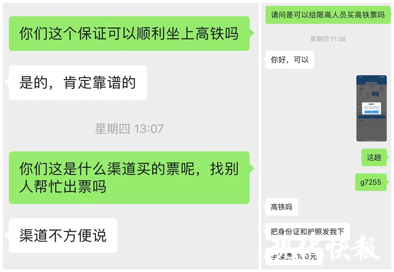 不到半小時(shí),這位群主便回復(fù)記者可以購(gòu)買(mǎi)機(jī)票,加上手續(xù)費(fèi)一共需要2401元。記者詢問(wèn)為何自己在飛豬等平臺(tái)看只需600元左右的機(jī)票,群主告訴記者,有手續(xù)費(fèi)也有涉及到稅率造成的差價(jià)等。記者將這位限高人員的身份證信息提供給另一位黃牛,咨詢是否能幫忙購(gòu)買(mǎi)高鐵票。這位黃牛告訴記者沒(méi)問(wèn)題,只不過(guò)需要加1100元的手續(xù)費(fèi)。“代買(mǎi)高鐵票的話,不管原價(jià)多少手續(xù)費(fèi)都是固定的1100元,代買(mǎi)機(jī)票的話,手續(xù)費(fèi)還會(huì)更高一些。”