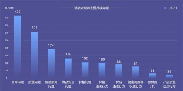 從投訴問題看,全省12315熱線平臺受理投訴主要反映問題有:合同問題427件、質(zhì)量問題307件、售后服務(wù)問題174件、食品安全問題136件、價格問題102件。