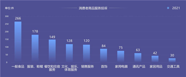 從商品類型看,群眾通過全省12315熱線平臺投訴舉報較多的商品類別依次為:一般食品266件、服裝鞋帽178件、餐飲和住宿服務(wù)149件、文化娛樂體育服務(wù)128件、銷售服務(wù)120件。