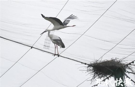 2 月份是東方白鸛的繁殖季節(jié)。最近,這只野生的東方白鸛每天都會(huì)銜著樹(shù)枝,在鳥(niǎo)籠頂部筑巢。如今,這個(gè)為 " 愛(ài) " 而建的鳥(niǎo)巢已經(jīng)初具雛形。每天,這只野生的東方白鸛都會(huì)與園內(nèi)的伴侶 " 隔籠相望 "。