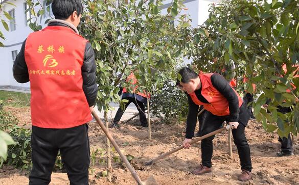 在官尖村新型社區(qū),鎮(zhèn)黨委、政府領(lǐng)導(dǎo)班子帶領(lǐng)40多名機(jī)關(guān)干部和群眾一起栽上一株株茁壯的樹(shù)苗。全鎮(zhèn)21家單位紛紛組織員工走進(jìn)綠色田野,揮灑汗水,挖塘栽樹(shù)。各村紛紛響應(yīng),一支支由黨員群眾組成的志愿服務(wù)隊(duì),穿上醒目的志愿者紅馬甲,在堆堤、在田間、在百姓的住房四旁,伴隨歡聲笑語(yǔ),栽下片片綠。