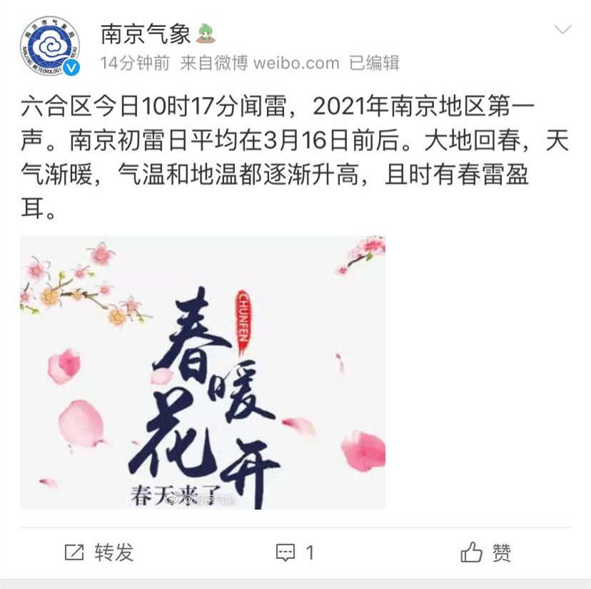 (記者 徐紅艷)3月15日10時17分,六合地區(qū)響起雷聲,這也是2021年南京地區(qū)第一聲?,F(xiàn)代快報記者了解到,南京初雷日平均在3月16日前后。