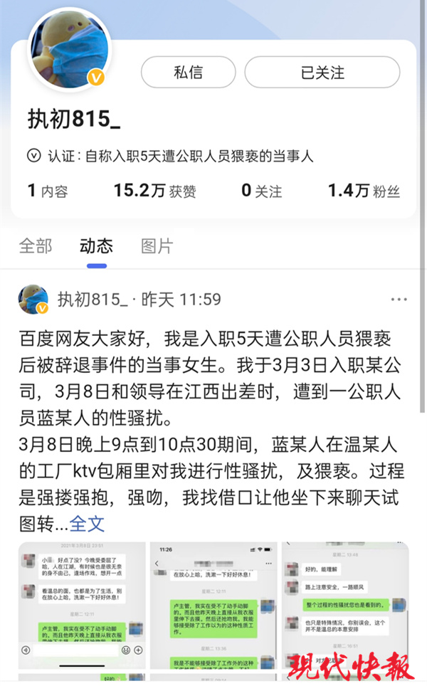 現(xiàn)代快報(bào)記者發(fā)現(xiàn),該網(wǎng)帖發(fā)布于3月15日,@執(zhí)初815_ 在網(wǎng)帖中稱,自己于3月3日入職廣州某公司,3月8日和領(lǐng)導(dǎo)在江西出差,期間在一家KTV包廂中遭到當(dāng)?shù)厮痉ň忠凰{(lán)姓副局長(zhǎng)的強(qiáng)吻、摟抱,觸摸隱私部位等騷擾。