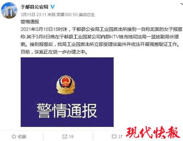 記者注意到,3月15日23點(diǎn)11分,江西于都縣公安局通過(guò)其官方微博發(fā)布了“警情通報(bào)”:“2021年3月10日15時(shí)許,于都縣公安局工業(yè)園派出所接到一自稱龍某的女子報(bào)警稱:其于3月8日晚在于都縣工業(yè)園某公司內(nèi)部KTV被當(dāng)?shù)厮痉ň忠凰{(lán)姓副局長(zhǎng)猥褻。接到報(bào)警后,我局工業(yè)園派出所立即受理該案件并依法開(kāi)展調(diào)查取證工作。目前,該案正在進(jìn)一步辦理之中。”