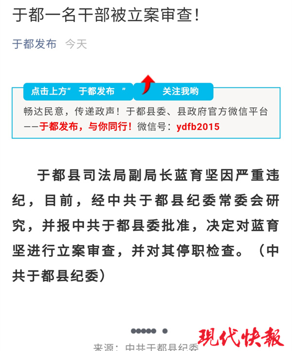 3月16日上午,記者致電江西省于都縣紀(jì)委。一名工作人員表示,紀(jì)委已經(jīng)介入調(diào)查此事,后續(xù)若有調(diào)查結(jié)果會(huì)對(duì)外公布。于都縣紀(jì)委也在當(dāng)天中午發(fā)布消息:“于都縣司法局副局長(zhǎng)藍(lán)育堅(jiān)因嚴(yán)重違紀(jì),目前,經(jīng)中共于都縣紀(jì)委常委會(huì)研究,并報(bào)中共于都縣委批準(zhǔn),決定對(duì)藍(lán)育堅(jiān)進(jìn)行立案審查,并對(duì)其停職檢查。”