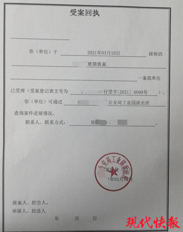 @執(zhí)初815_ 表示,她已在江西、廣東兩地報(bào)警,希望為自己的遭遇討個(gè)說(shuō)法?,F(xiàn)代快報(bào)記者注意到,@執(zhí)初815_ 在網(wǎng)帖中展示了自己報(bào)警后獲取的受案回執(zhí),該回執(zhí)單落款為某地公安局工業(yè)園區(qū)派出所,報(bào)警時(shí)間為3月10日,原因?yàn)?ldquo;猥褻案”。