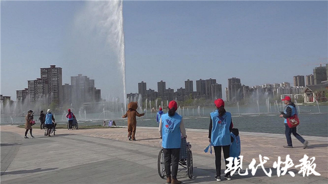 在千鶴湖公園門口,不能行走的殘障小朋友由志愿者推著輪椅前行,還有幾個(gè)小朋友則坐上了公園管理方提供的電瓶觀光車,一路領(lǐng)略公園的美景。得知是公益活動(dòng),公園管理方還特地打開(kāi)了只在晚間才開(kāi)的音樂(lè)燈光噴泉,讓孩子們觀看奇妙的水上舞蹈。