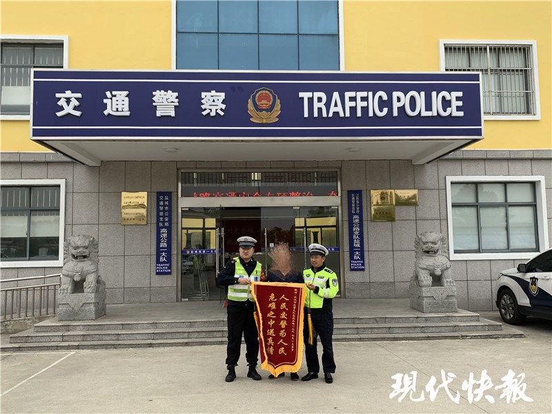 5月6日中午,經過搶救和治療,駕駛員王師傅康復出院了,他特地在當地趕制了一幅錦旗,上面寫著:人民交警為人民,危難之中送真情,專門送到鹽城市高速一大隊,感謝高速民警的救命之恩。(通訊員供圖)