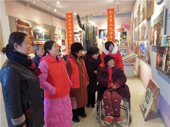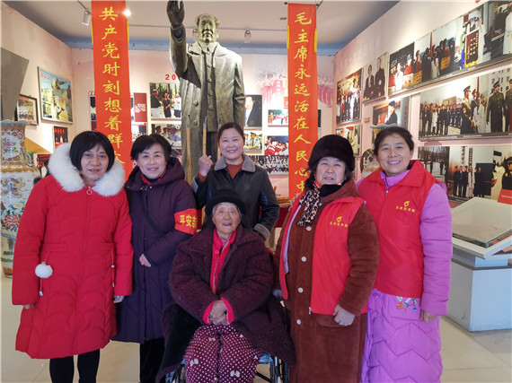 在莊印芳擁軍館,曹愛紅等把燒雞、食品、糕點(diǎn)等慰問品送到莊大媽手里,親切的尋問她的身體及生活情況,向她致以新年的祝福。慰問團(tuán)成員在擁軍館和莊印芳老人一起向館內(nèi)的毛澤東銅像鞠躬致哀,以表達(dá)對(duì)偉大領(lǐng)袖毛主席的深切懷念,紀(jì)念毛澤東誕辰128周年。隨后慰問團(tuán)成員還和莊媽媽一起合唱《大海航行靠舵手》,《東方紅》、《歌唱親人解放軍》等革命歌曲,藝術(shù)團(tuán)成員還參觀了莊印芳擁軍事跡展,一幅幅感人的擁軍事跡照片、一面面各地軍營(yíng)贈(zèng)送的錦旗,大家都被莊印芳老人心系國(guó)防、擁軍愛軍、無(wú)私奉獻(xiàn)的高尚情懷而感動(dòng)。莊印芳老媽媽也向藝術(shù)團(tuán)成員回顧了自己從淮海戰(zhàn)役擁軍支前到和平年代幾十年如一日,始終不渝,擁軍愛軍的經(jīng)歷,對(duì)藝術(shù)團(tuán)成員進(jìn)行擁軍愛軍和雙擁傳統(tǒng)教育,她要求大家要珍惜現(xiàn)在幸福生活,不忘戰(zhàn)爭(zhēng)年代為解放全中國(guó)而流血犧牲的革命前輩,不忘偉大領(lǐng)袖毛主席。