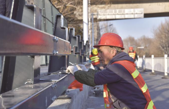 1月29日,工人在天橋路跨鐵路橋上安裝新型SS級防撞護欄。這種防撞護欄壁厚達7毫米,由15×12厘米的大口徑方管及構件組成,主要用于鐵路橋梁。目前正首次在鎮(zhèn)江城區(qū)的天橋路跨鐵路橋及解放路跨鐵路橋上安裝施工。