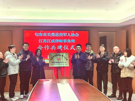 1月4日下午,句容市關愛退役軍人協(xié)會法律援助服務中心掛牌儀式在江蘇江成律師事務所會議室舉行。協(xié)會秘書長陳靚與律師事務所執(zhí)行主任艾滔勇共同為協(xié)會法律援助服務中心揭牌,同時,協(xié)會還聘請了律師所副主任傅從華為協(xié)會的法律顧問。