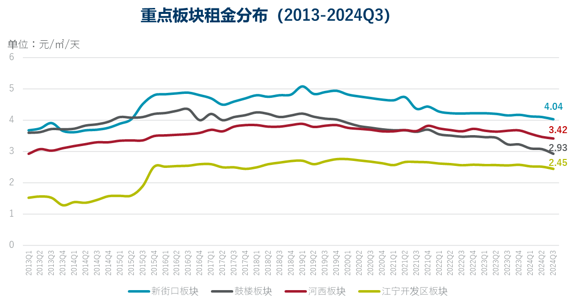 三季度,市場平均租金下降趨勢有所減弱,租金降幅環(huán)比收窄。目前全市平均租金約人民幣2.59元/平方米/天,重點(diǎn)板塊租金均價約3.2元/平方米/天,全市平均租金與2024年第一、二季度相比,環(huán)比降幅分別從1.6%和2.3%收窄至0.7%。