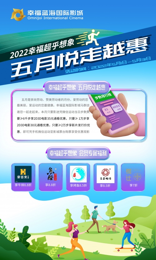 五月是崇尚勞動、贊美勞動者的月份,愛勞動的您最美麗,愛運動的您最健康。幸福藍海國際影城邀您一起走起來,本月只要影迷憑微信運動當日步數(shù)只要≥6000步,即可憑手機微信運動至影城票臺購票享受2D3D電影35元通看優(yōu)惠,≥10000步以上享受2D3D電影30元通看優(yōu)惠,≥20000步以上可享受影片發(fā)行價觀影。