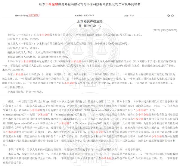 7月7日,北京知識產(chǎn)權(quán)法院發(fā)布民事判決書,對山東小米金融服務(wù)外包有限公司、小米科技有限責(zé)任公司之間的糾紛做出二審判決。